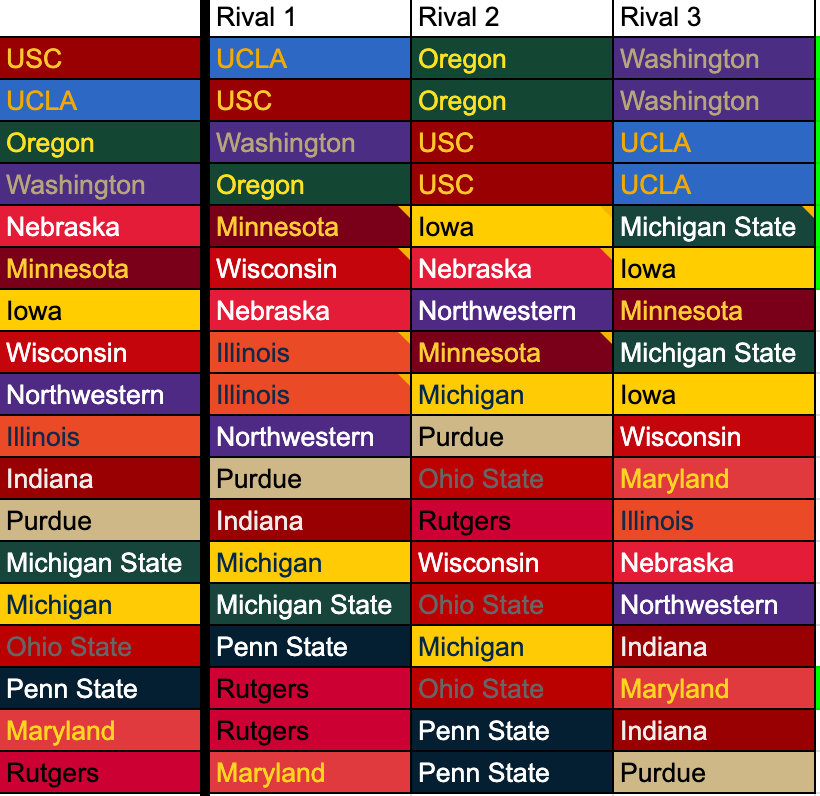 With all the changes in college athletics, keep some niche things that have value: rivalries. I have done the work already for the Big Ten conference. Each team should have three permanent two-play rivals. Here they are: