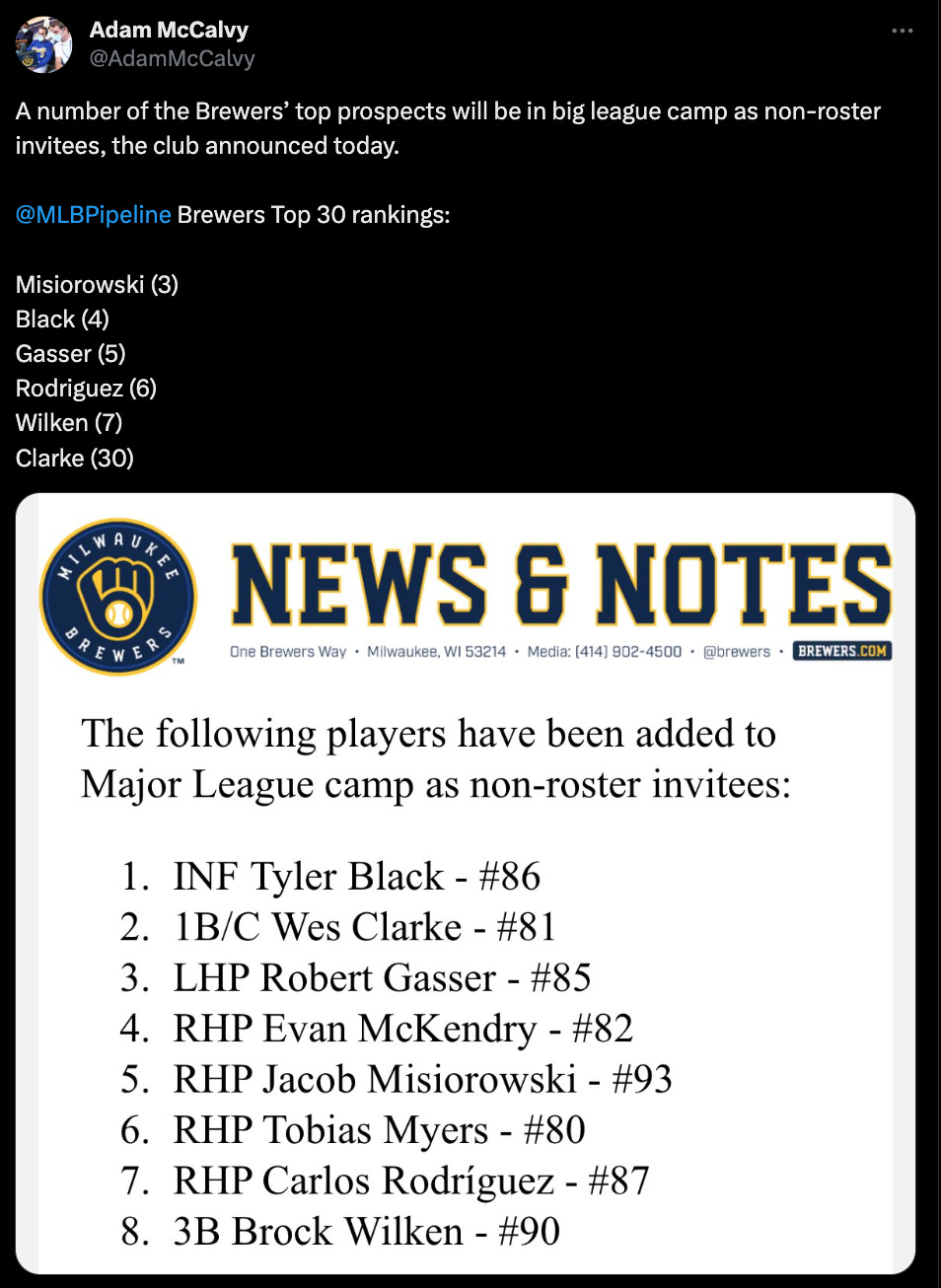 The Milwaukee Brewers announced the names of several prospects who have been invited to spring training. Despite not being on the Brewers roster, these minor-leaguers are getting a shot at impressing the staff of the big league club.