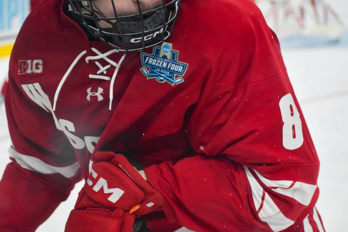Wisconsin defenseman Aiden Dubinsky chases down a puck in the 2026 Frozen Four. Photo Credit: AMF Photography