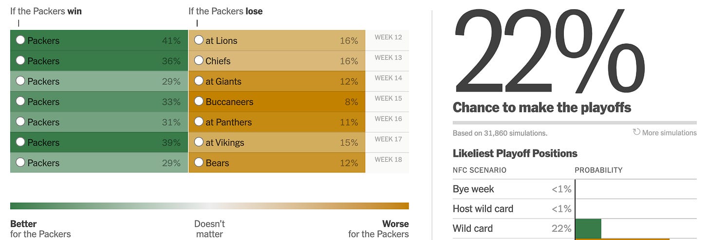 According to the New York Times’ NFL Playoff Odds simulator, Green Bay currently has approximately a 22% chance of making the playoffs. You may be rolling your eyes, but don’t give up on me yet. The Packers are currently the eighth seed in the NFC - just one spot out of the last Wild Card.