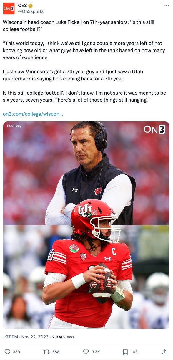 Instead of simply answering the question, Fickell turned it into a diatribe to ask “is this still college football?” He bemoaned the amount of eligibility players now have. He bemoaned Utah quarterback Cam Rising announcing his return in 2024 for a seventh season.