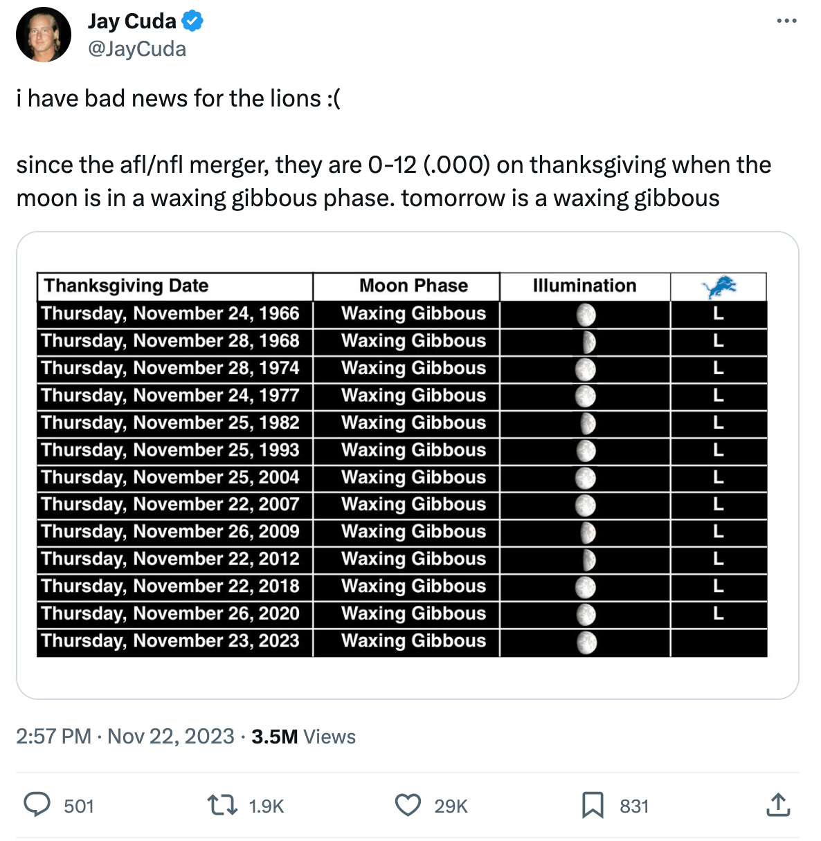 Shout out to Jay Cuda for discovering this nugget. Since the AFL-NFL merger, the Detroit Lions are 0-12 on Thanksgiving when the moon is in a waxing gibbous phase. You would not believe it if I told you what phase the moon is in tomorrow evening.