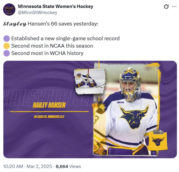 The skaters in front of Hansen have a lot of defensive production to replace, too. Minnesota State returns only 33.43% of its blocked shots, by far the lowest share returning in the league. No other team in the WCHA returns less than 47%. Twin defenders Jenessa and JuliAnna Gazdik are transferring, in conference, to St. Thomas, leaving a mighty presence in front of the net to replace. Jenessa logged more than twice the number of blocks of any other Mavericks skater in 2024-25, other than her sister. JuliAnna’s 70 were the fourth-most of any player in the conference.