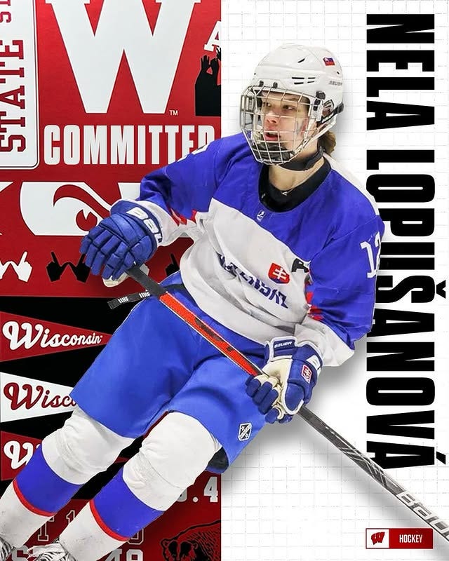 Nela Lopušanová committed to Wisconsin on Monday, according to her Instagram. “I am extremely proud and honored to announce my commitment to play Division 1 ice hockey at University of Wisconsin,” she wrote ahead of her junior year of high school. “I want to thank my family, coaches, and friends for helping my dreams come true!”